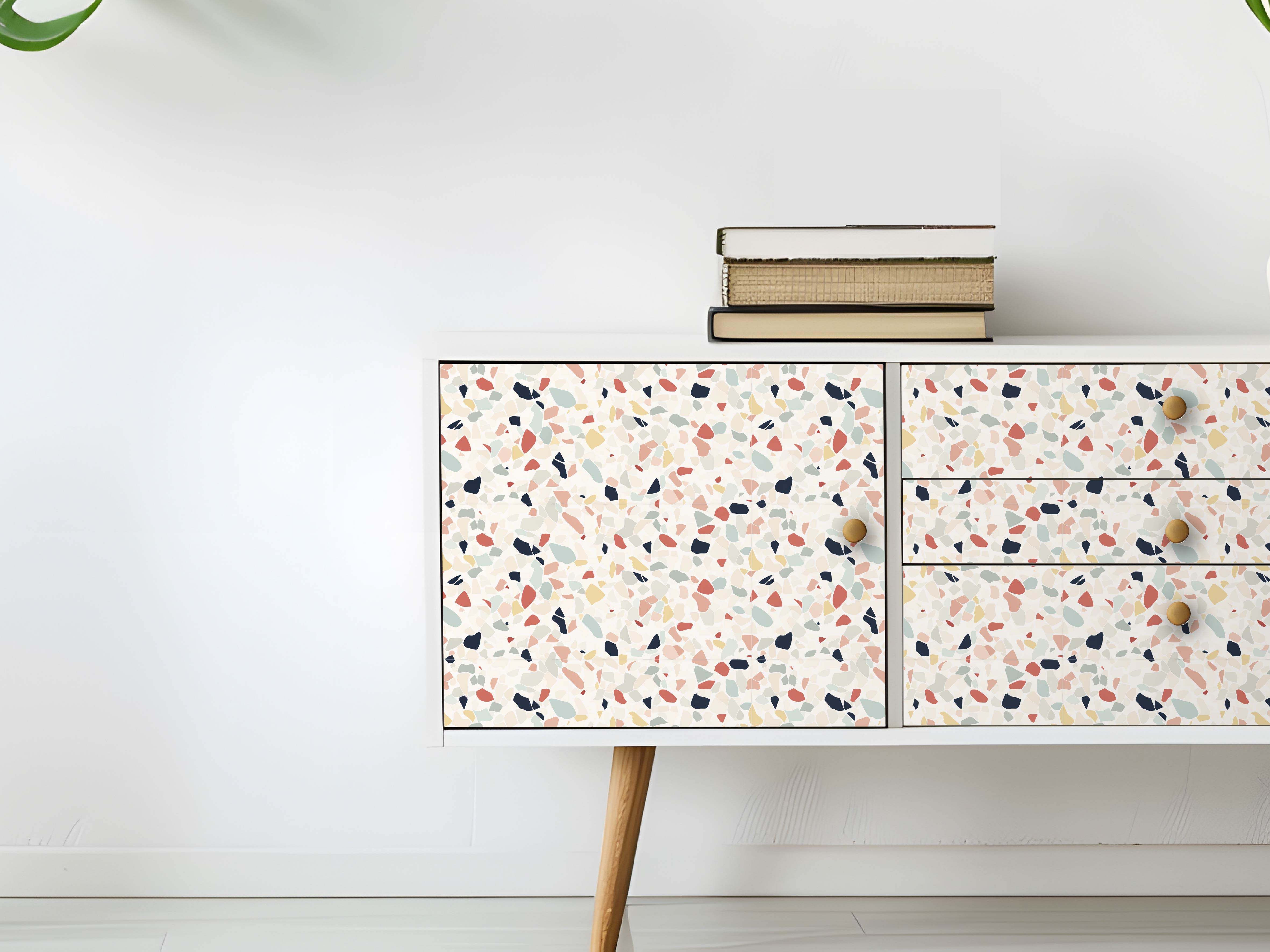 Möbelfolie in moderner Terrazzo-Optik – selbstklebend, strapazierfähig & pflegeleicht. Perfekt für kreative DIY-Projekte & farbenfrohe Akzente.
